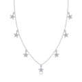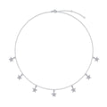 Add a touch of magic to your everyday style with this enchanting necklace. Featuring a delicate chain adorned with sparkling star charms, it creates a whimsical yet sophisticated look. Each tiny star is encrusted with glimmering Moissanite stones that sparkle like the night sky. Crafted from 925 sterling silver and plated in platinum, this lightweight piece sits gracefully at the collarbone, making it perfect for layering or wearing alone as a dreamy statement.