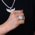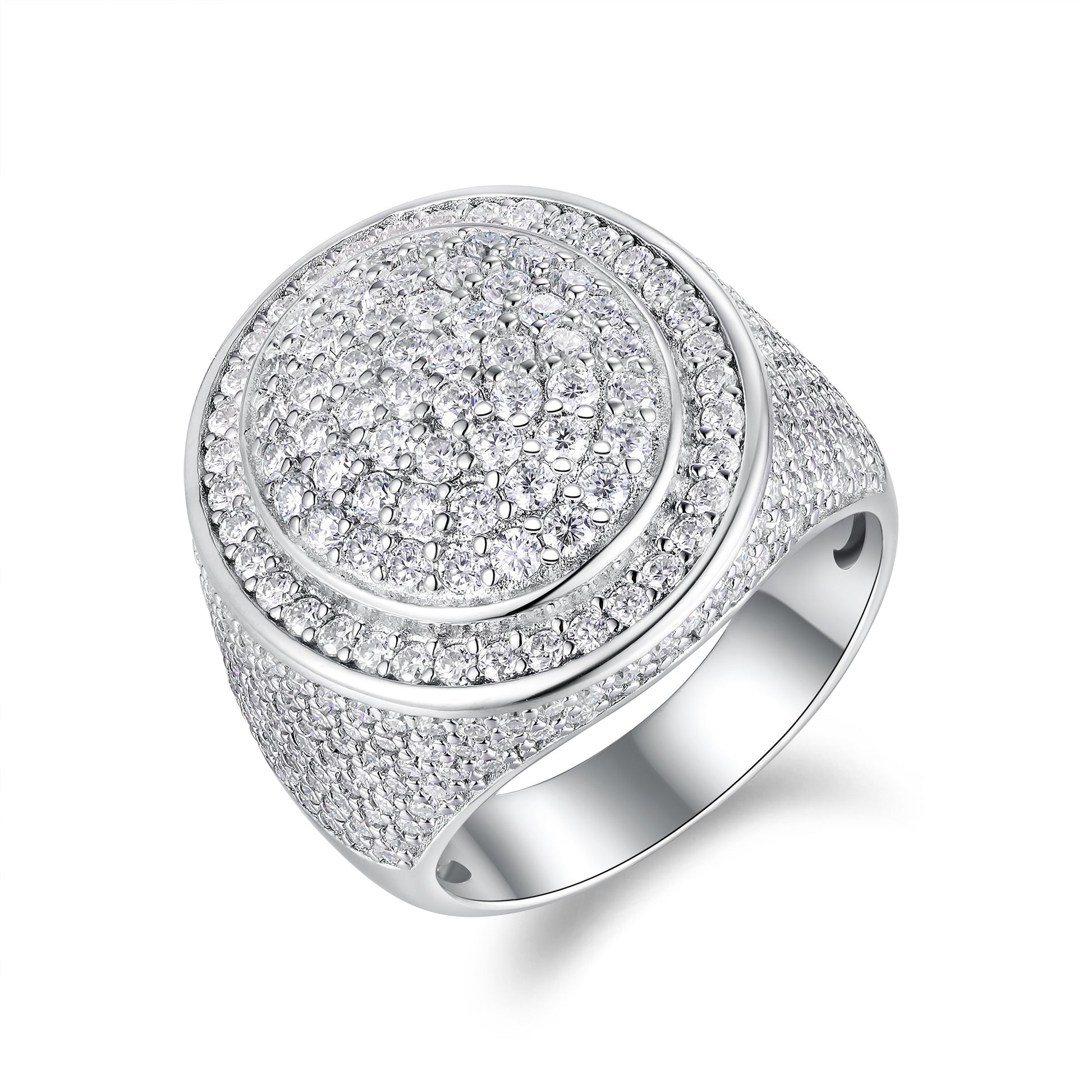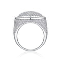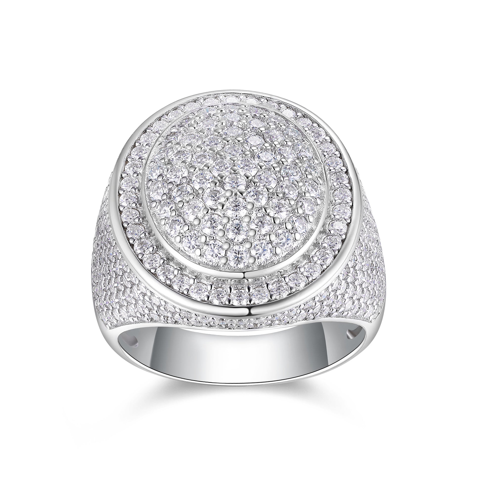 Command attention with this massive statement piece, designed for those who demand excellence. Weighing in at a substantial 13 grams, "The Sovereign" features a bold circular face densely packed with precision-cut Moissanite stones. With approximately 70 individual stones of ~ 0.1 carats each, this ring boasts a total weight of around 7 carats, delivering an blinding "iced out" brilliance from every angle. Cast in solid 925 sterling silver and plated in platinum, it offers the heft and shine of a high-end heirloom.